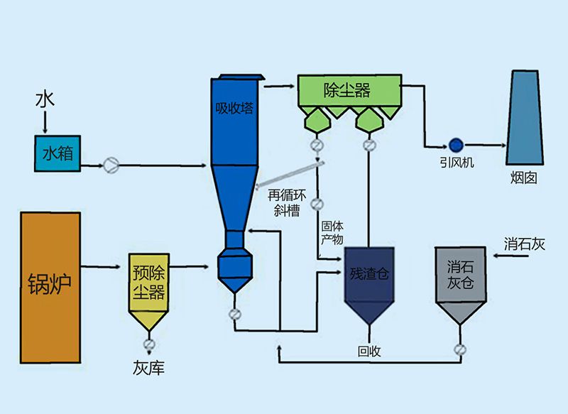 半干法烟气脱硫工艺,借鉴循环流化床的工作原理,使吸收剂在反应器内以流态化方式多次循环,延长吸收剂与烟气的接触时间,从而大大提高吸收剂的利用效率,并提高脱硫效率,其特点是流程简单、结构紧凑、投资低,适用于中低硫煤。